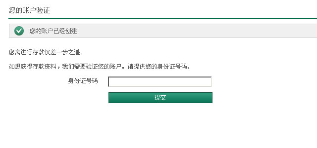 6、完成开户以后,会自动登录网站,并出现下面的账户验证页面,通过验证才能获得存款资料,这也是为了您的取款账户安全,所以请输入正确的身份证号码。再次声明:您的资料我们会绝对保密,不会透露给任何第三方,而且严格加密保存于英国,所以您可以完全放心!